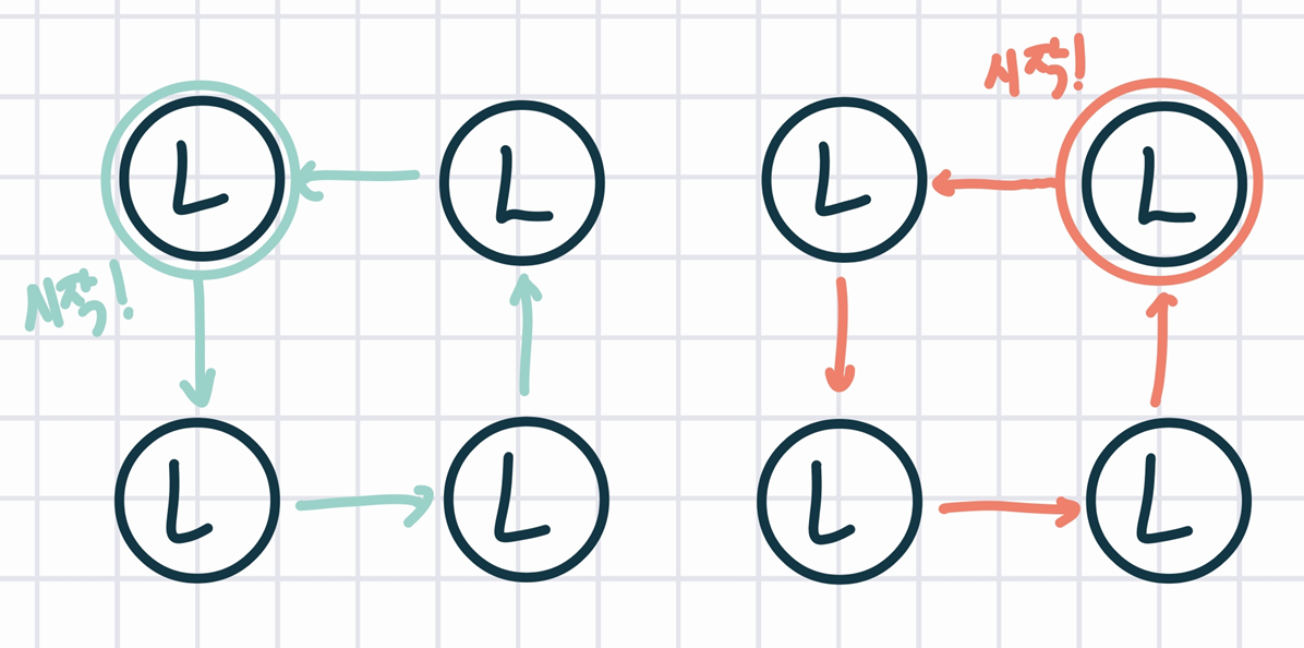 예를 들어, 다음 그림은 격자 ["SL","LR"]에서 1행 1열에서 2행 1열 방향으로 빛을 쏠 경우, 해당 빛이 이동하는 경로 사이클을 표현한 것입니다.